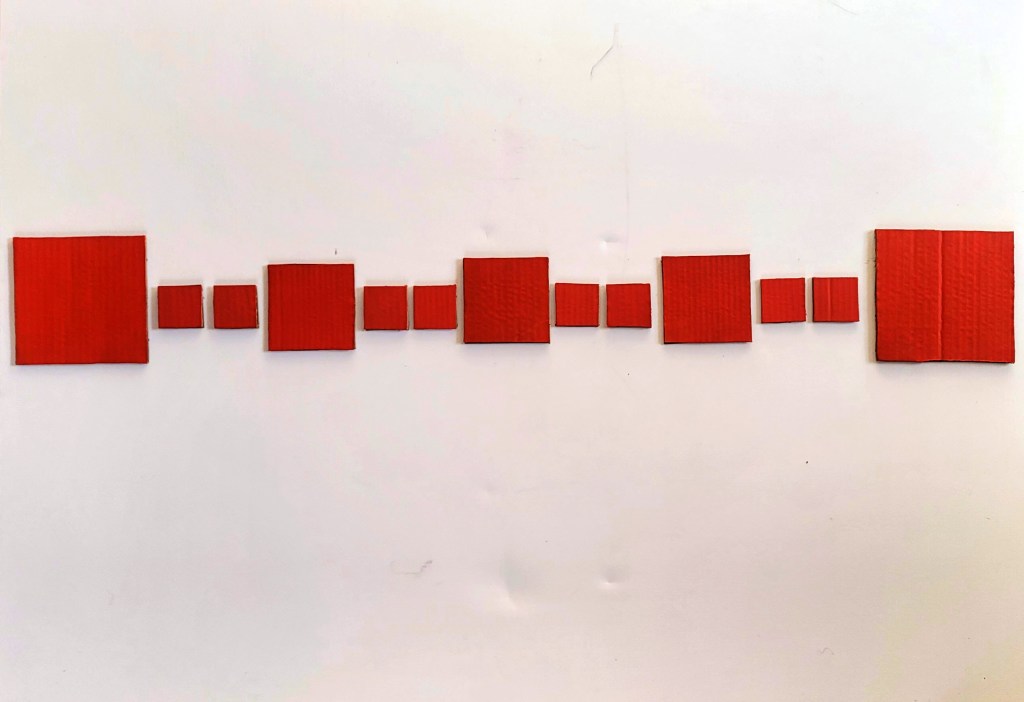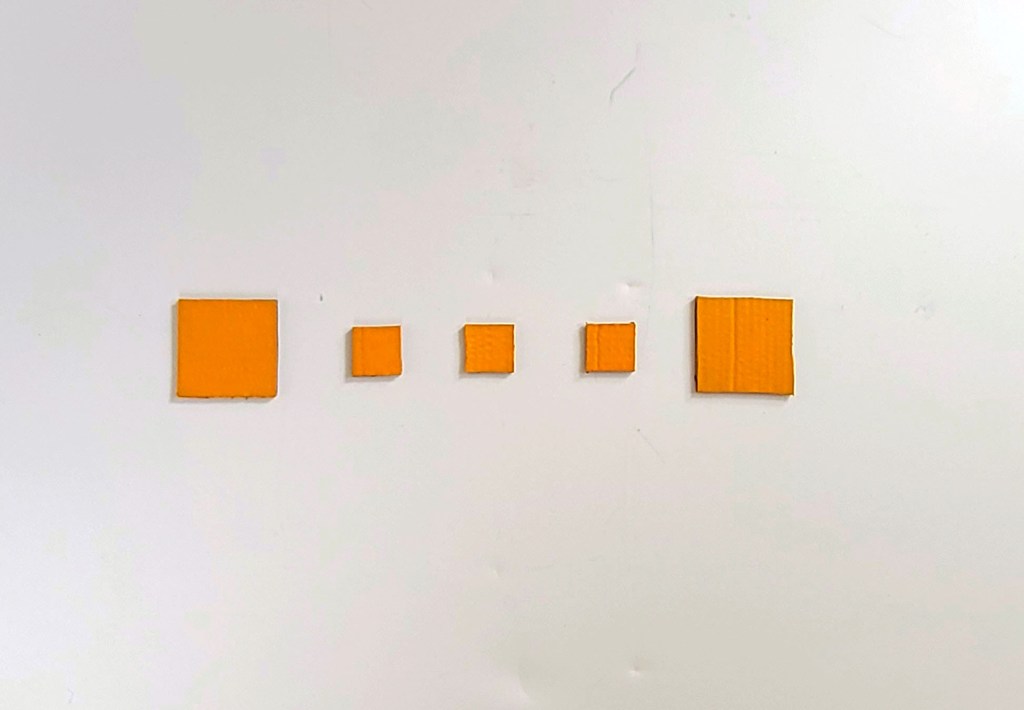 Oscillation – Orange | 2024 | Size varies on desired spacing, individual pieces are as follows: 6in x 6in, 2in x 2in and 4in x 4in | Cardboard & Acrylic Paint