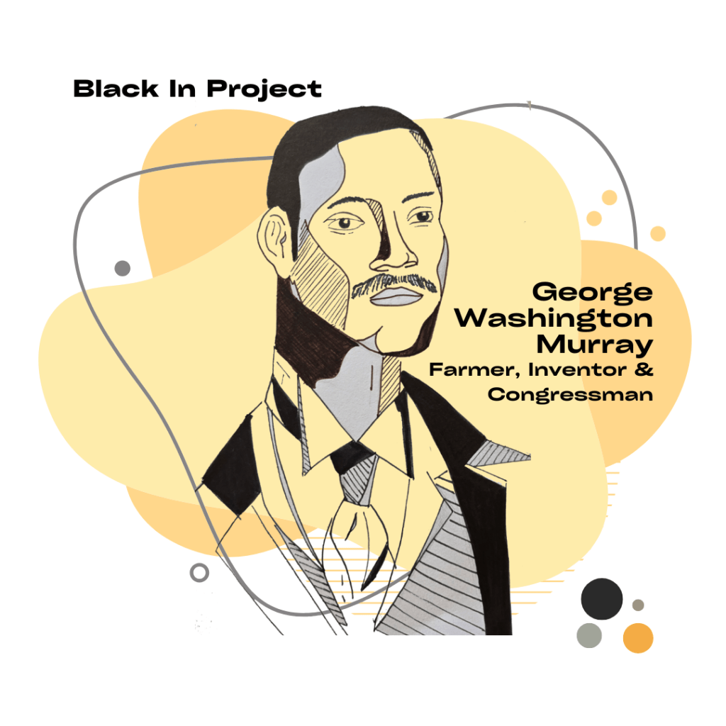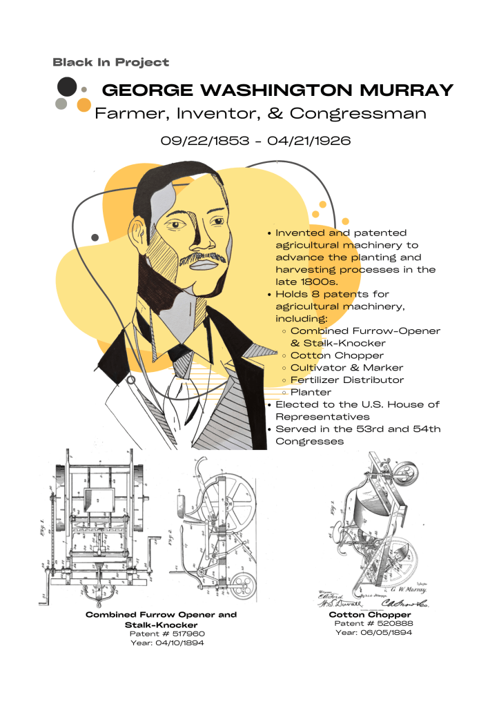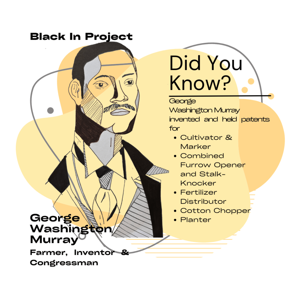 **Please note that the illustration of George Washington Murray was drawn by me, Jakia Fuller. Images of the inventions are patent sketches from George Washington Murray’s patent applications, which can be found on the official United States Patent and Trademark Office website and Google Patents.**